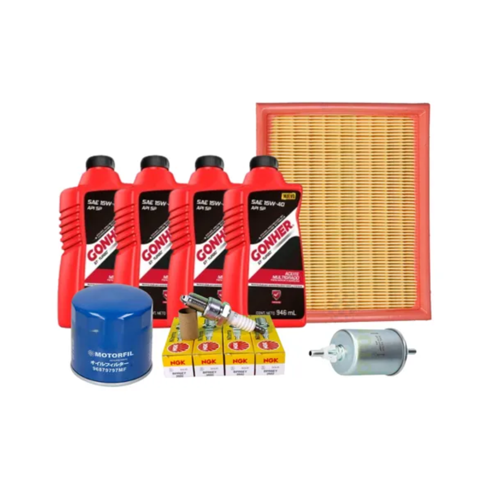 INCLUYE: 1 FILTRO DE GASOLINA 25161333 1 FILTRO DE ACEITE 25010792 1 FILTRO DE AIRE 90411732 4 BUJIAS NGK ESTANDAR BPR6EY 4 Botellas Multigrado 15w40 Gonher Api Sp 946ml 103392