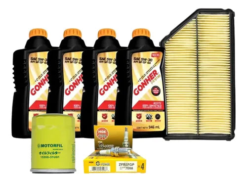 INCLUYE: FILTRO ACEITE---- 1520831U01 FILTRO AIRE---- GA385 6 BUJIAS NGK---- ZFR5FGP 4 BOTELLAS DE 946 ML GONHER SINTÉTICO 5W30 1033903